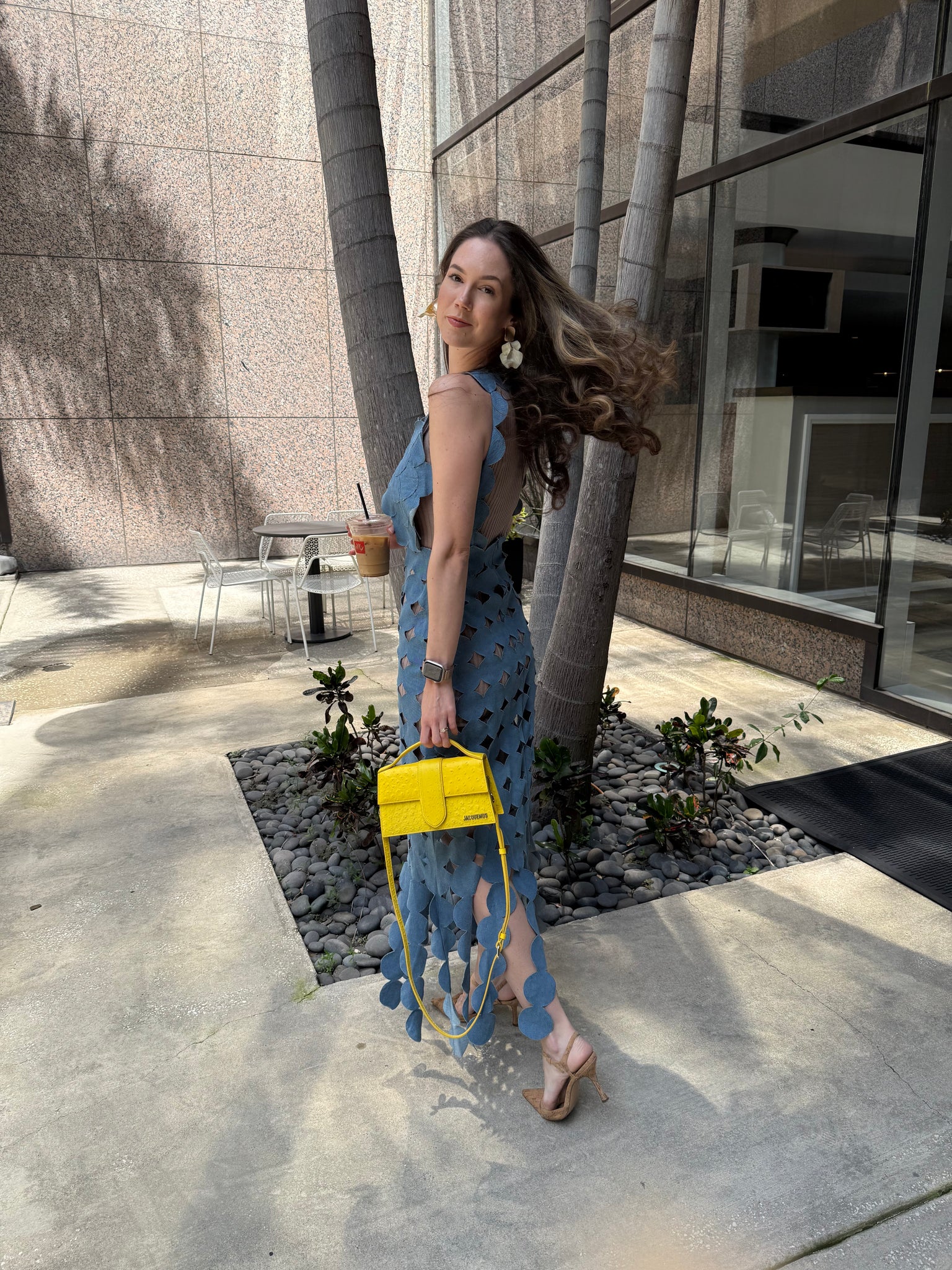 Halter top maxi dress featuring chic circular cutouts across the bodice, designed for a bold and sophisticated statement look.